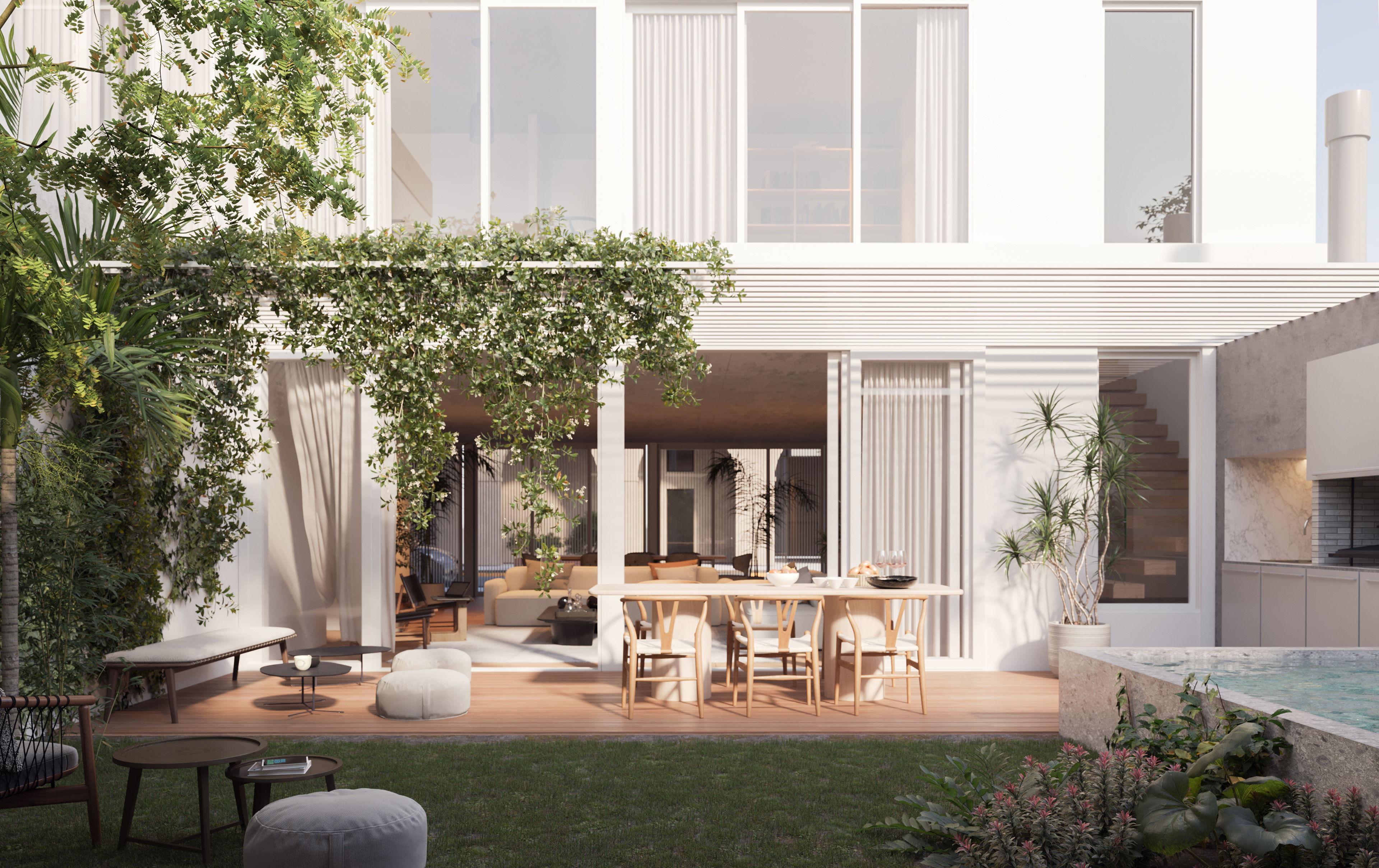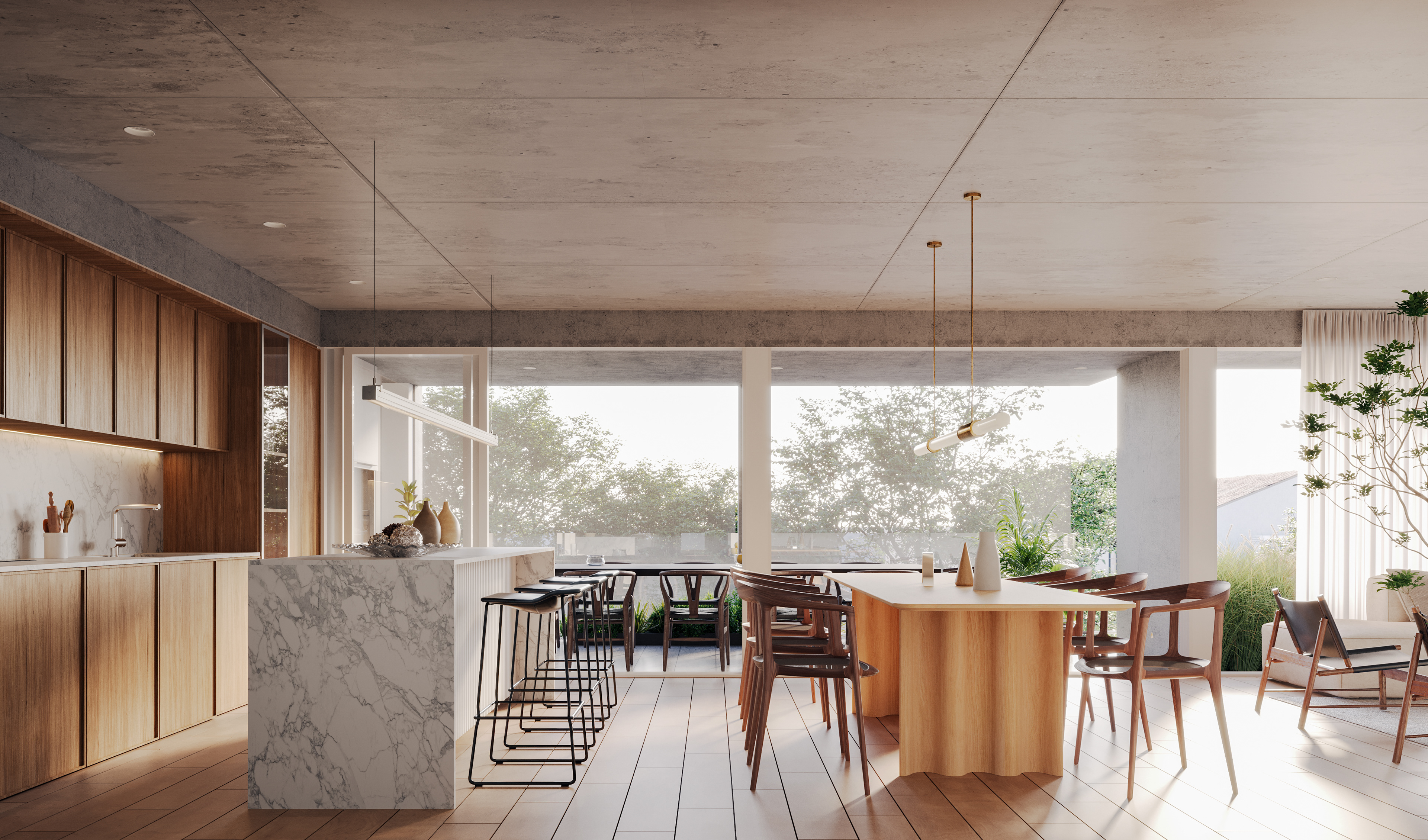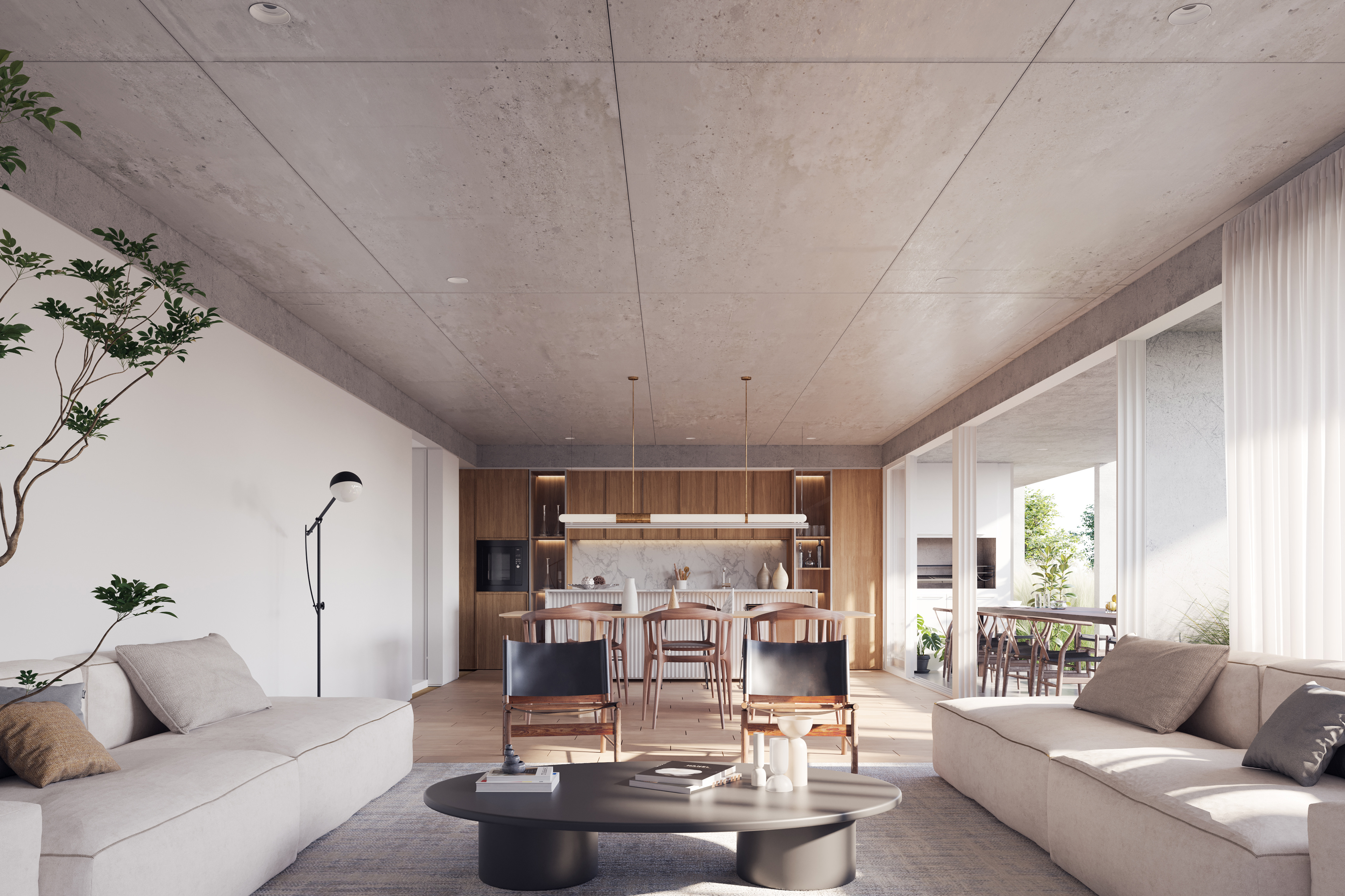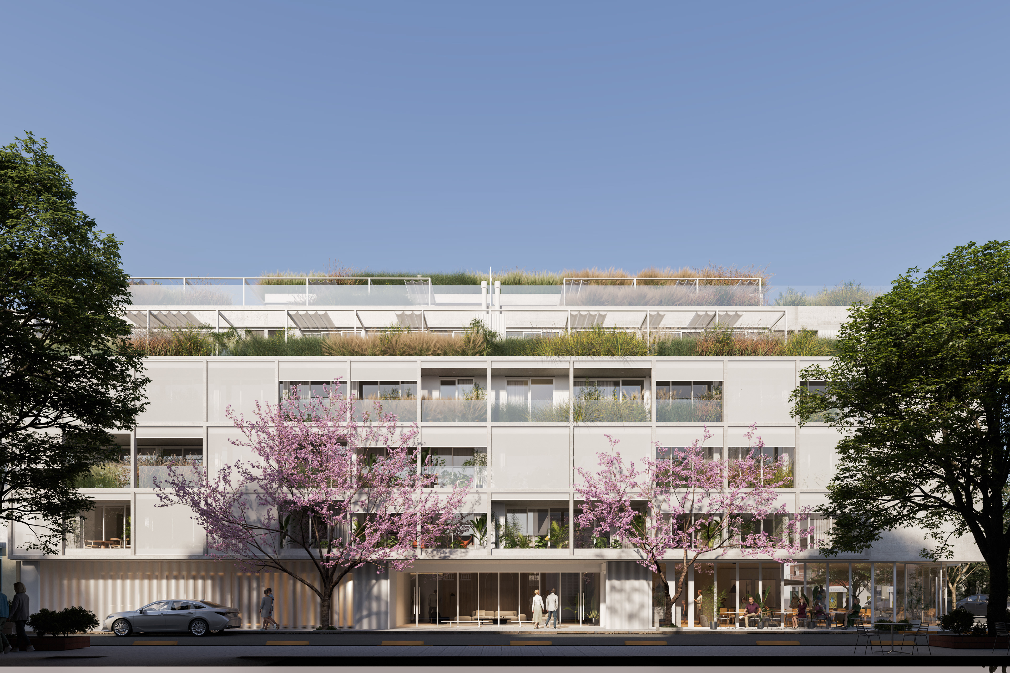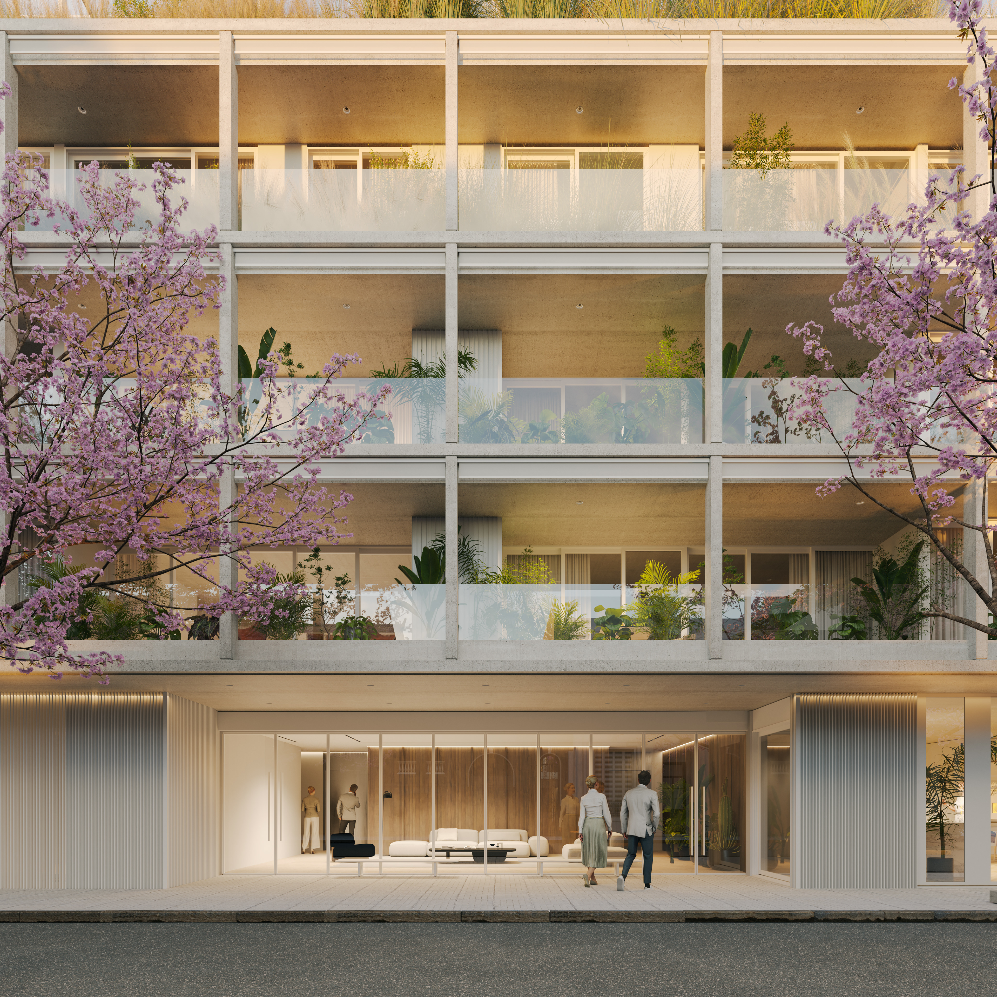 Generous indoor and outdoor spaces enhance openness and comfort, while privacy and calm are carefully addressed through the building’s low-rise scale and its relationship with the street. A flexible textile enclosure system allows for privacy without compromising natural light, encouraging a seamless extension of living spaces outdoors. Vegetation plays a central role in the project, with green areas integrated into each unit and strategically placed at bedroom exits to clearly define public and private zones, reinforcing a sense of retreat within the urban context.