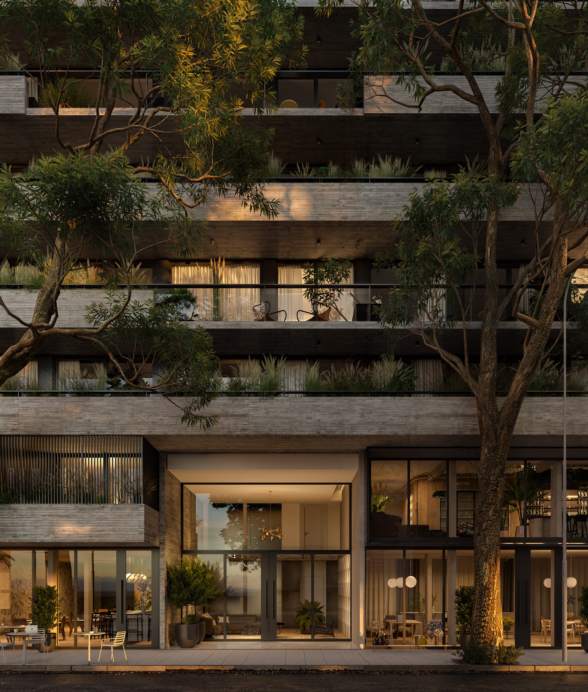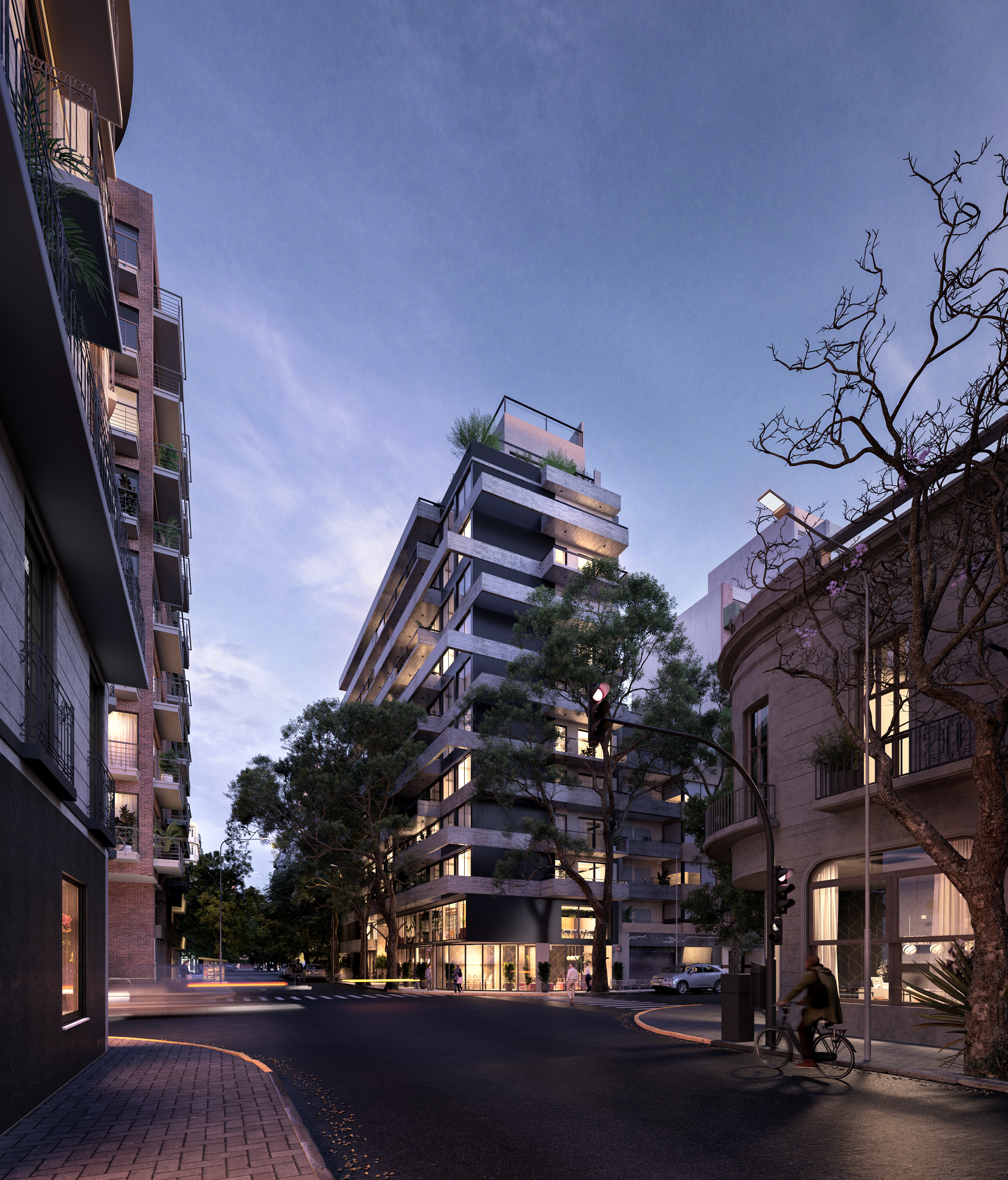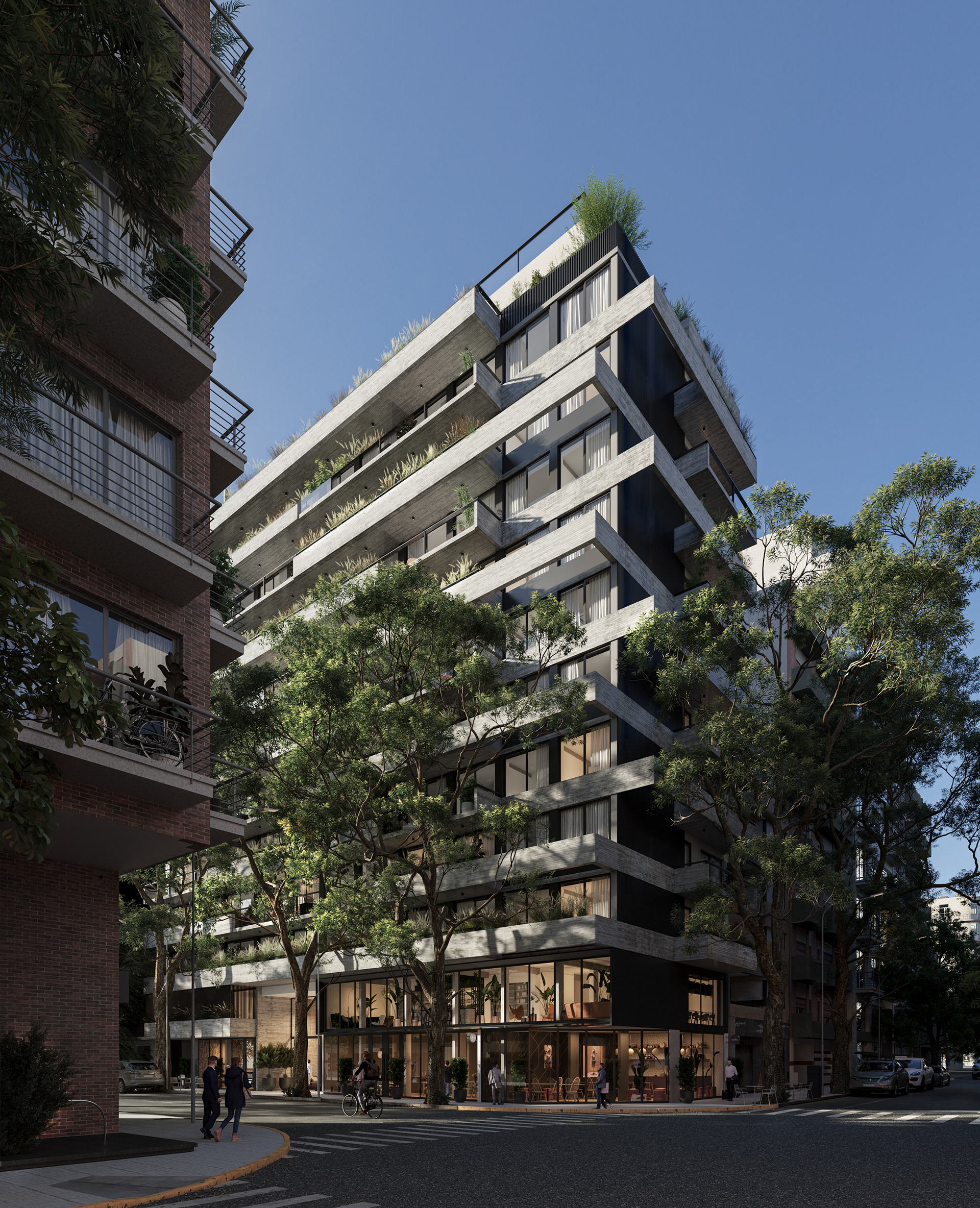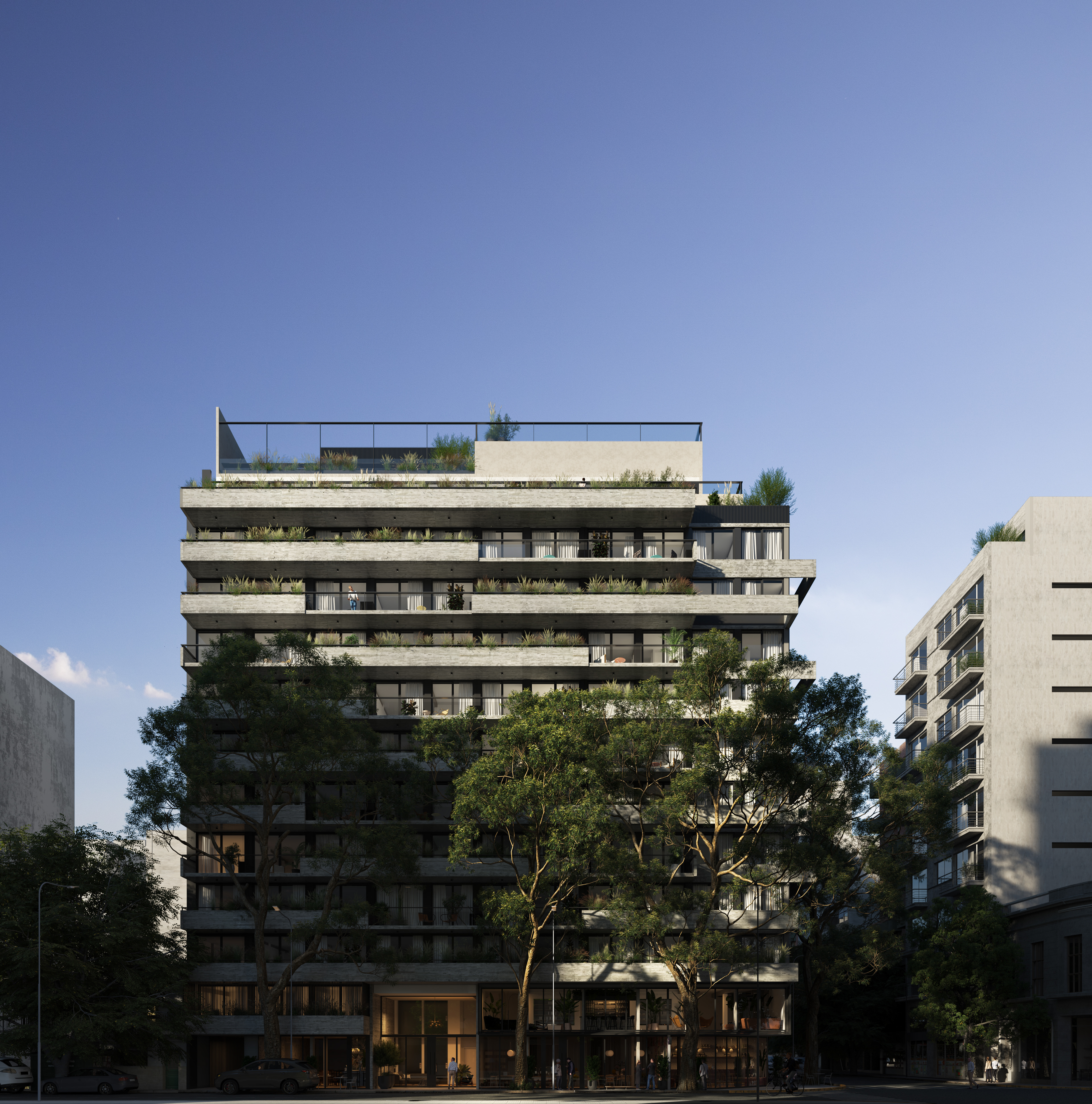 Palermo is a residential neighborhood known for being one of the greenest areas in Buenos Aires, characterized by tree-lined streets, wide avenues, and expansive parks. It is a dynamic district where residential homes, a thriving gastronomic scene, and cultural spaces coexist harmoniously. Located on a corner plot composed of three parcels, this project seeks to seamlessly integrate architecture and nature, embracing the essence of the neighborhood. Beyond its architectural expression, the project rethinks modern urban living by proposing a residential experience designed to enhance quality of life. With this vision, shared spaces are introduced to encourage healthy habits and strengthen community bonds. The building envelope is designed with high-performance materials to ensure thermal comfort, while the interior design focuses on creating spaces that evoke a sense of well-being and harmony. The facade incorporates horizontal elements that conceal lush planters, reinforcing the connection with greenery. These elements are arranged in a dynamic and irregular composition that unifies both street-facing facades and enhances the visual presence of the corner. The material approach is defined by the use of concrete as both a structural and facade element, emphasizing solidity and permanence, glass to maximize natural light and visual openness in each unit, and black sheet metal to introduce a contemporary contrast that refines the overall aesthetic. The interior design concept is based on architecture oriented toward well-being, using wood and stone as primary materials combined with a palette of light tones, vegetation, and modern, welcoming furniture. This approach creates a calming atmosphere that encourages the use of shared spaces, promoting social interaction and healthy habits. The spaces are designed with high ceilings, abundant natural light and ventilation, soft textures, curved furniture, and integrated greenery, enhancing comfort and overall well-being.