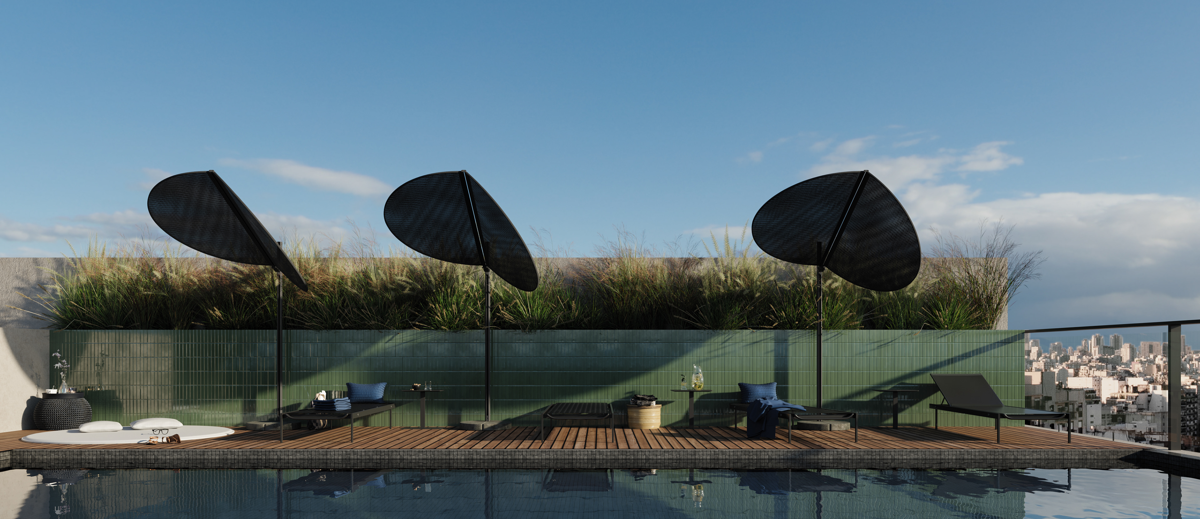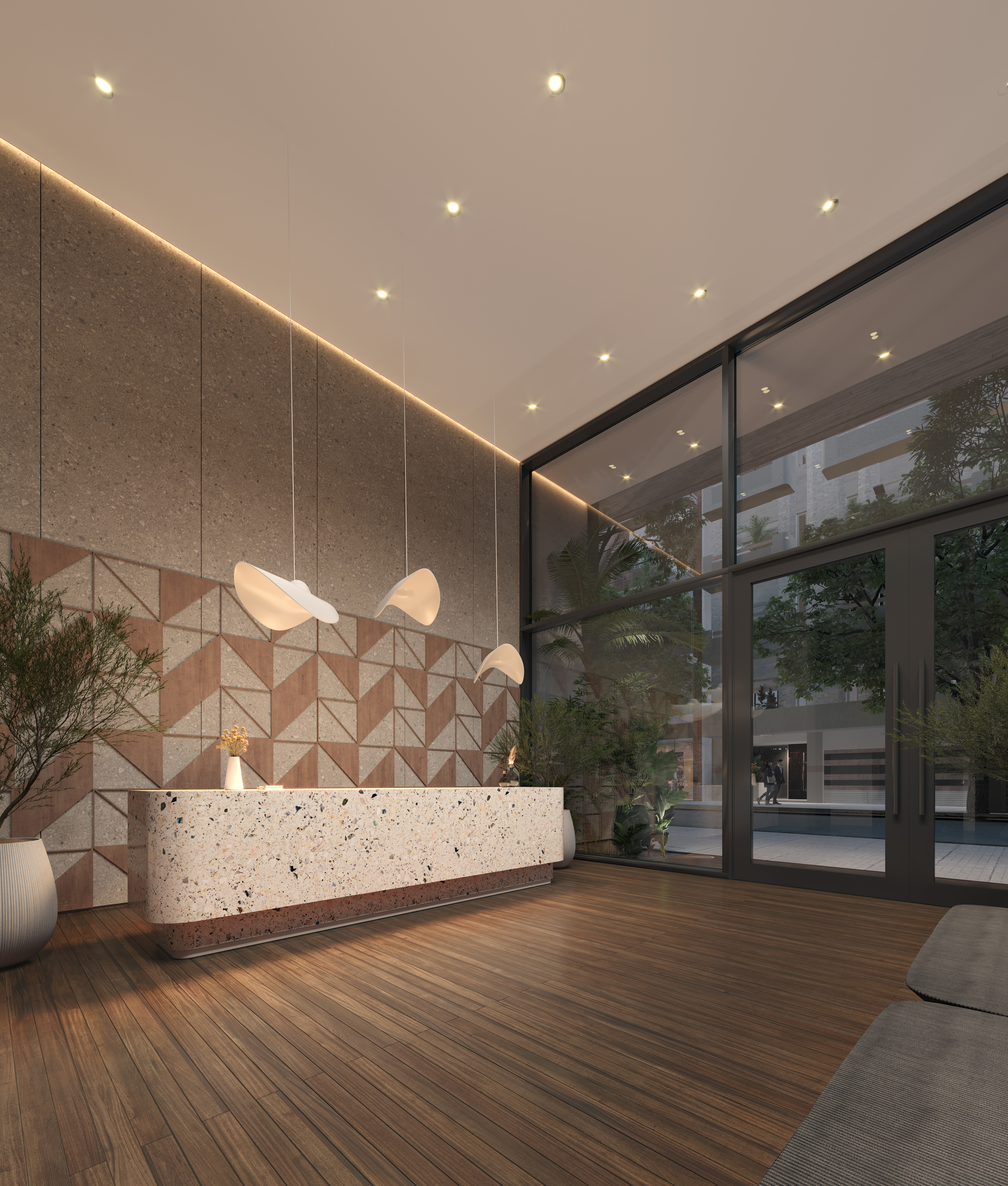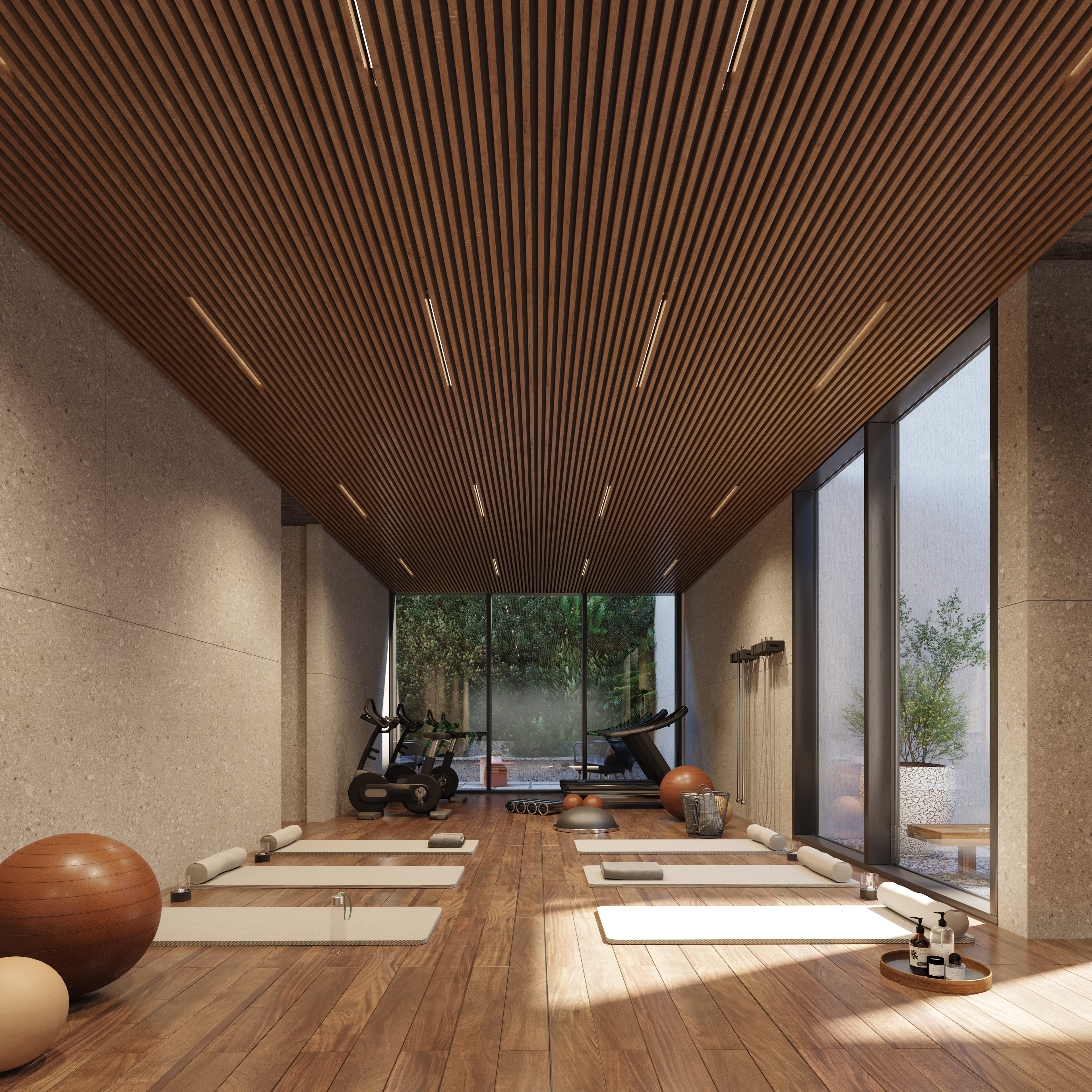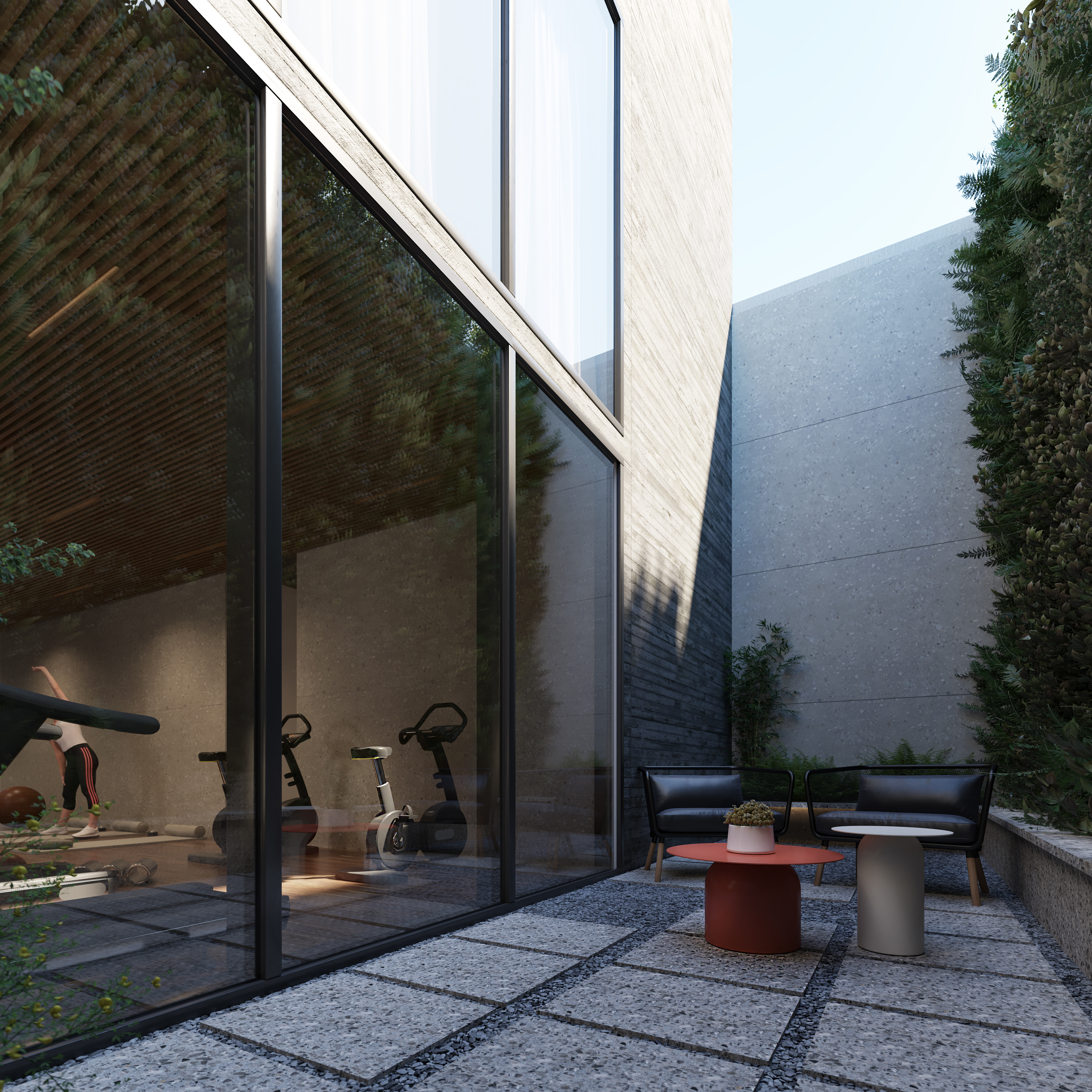 Palermo is a residential neighborhood known for being one of the greenest areas in Buenos Aires, characterized by tree-lined streets, wide avenues, and expansive parks. It is a dynamic district where residential homes, a thriving gastronomic scene, and cultural spaces coexist harmoniously. Located on a corner plot composed of three parcels, this project seeks to seamlessly integrate architecture and nature, embracing the essence of the neighborhood. Beyond its architectural expression, the project rethinks modern urban living by proposing a residential experience designed to enhance quality of life. With this vision, shared spaces are introduced to encourage healthy habits and strengthen community bonds. The building envelope is designed with high-performance materials to ensure thermal comfort, while the interior design focuses on creating spaces that evoke a sense of well-being and harmony. The facade incorporates horizontal elements that conceal lush planters, reinforcing the connection with greenery. These elements are arranged in a dynamic and irregular composition that unifies both street-facing facades and enhances the visual presence of the corner. The material approach is defined by the use of concrete as both a structural and facade element, emphasizing solidity and permanence, glass to maximize natural light and visual openness in each unit, and black sheet metal to introduce a contemporary contrast that refines the overall aesthetic. The interior design concept is based on architecture oriented toward well-being, using wood and stone as primary materials combined with a palette of light tones, vegetation, and modern, welcoming furniture. This approach creates a calming atmosphere that encourages the use of shared spaces, promoting social interaction and healthy habits. The spaces are designed with high ceilings, abundant natural light and ventilation, soft textures, curved furniture, and integrated greenery, enhancing comfort and overall well-being.